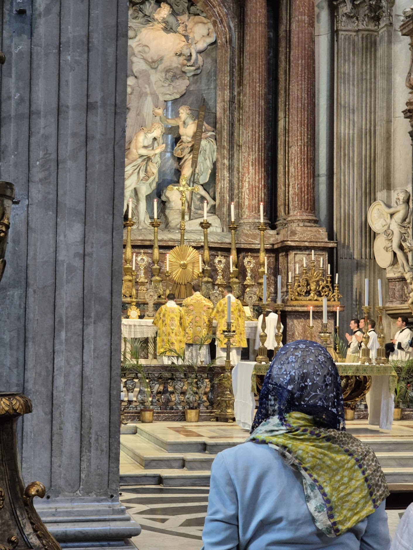 Ulaskom u baziliku svetog Petra, hodočasnici su u zajedništvu s kardinalom Gerhardom Müllerom častili relikvije sv. Petra koje se nalaze ispod glavnog oltara, te su ispovjedili svoju vjeru pjevajući Vjerovanje na latinskom jeziku. Zatim je uslijedilo klanjanje Presvetom Oltarskom Sakramentu izloženom na oltaru Stolice sv. Petra, a koje je predvodio kardinal Müller.
