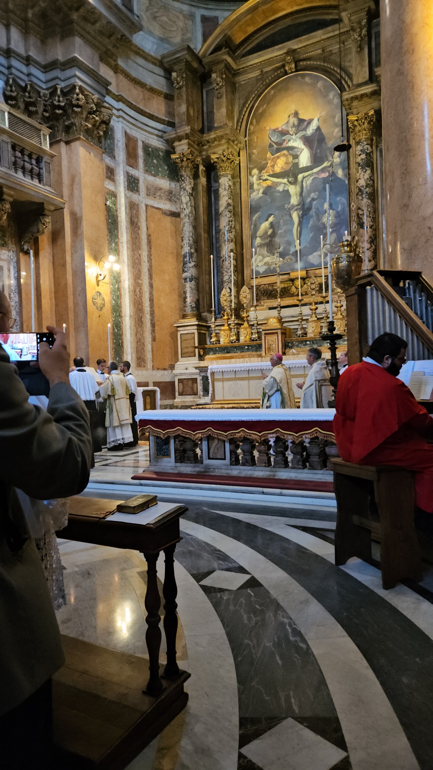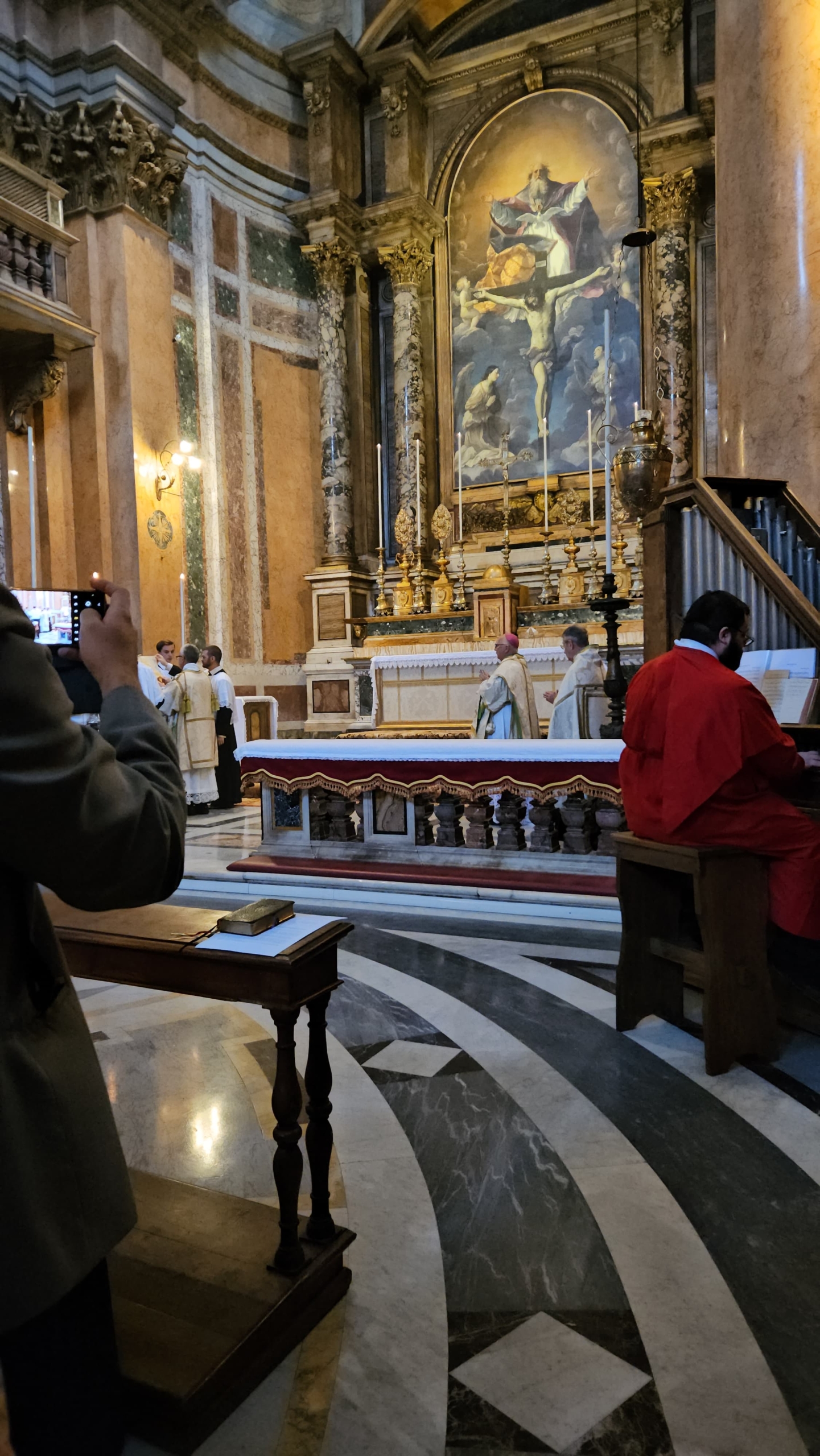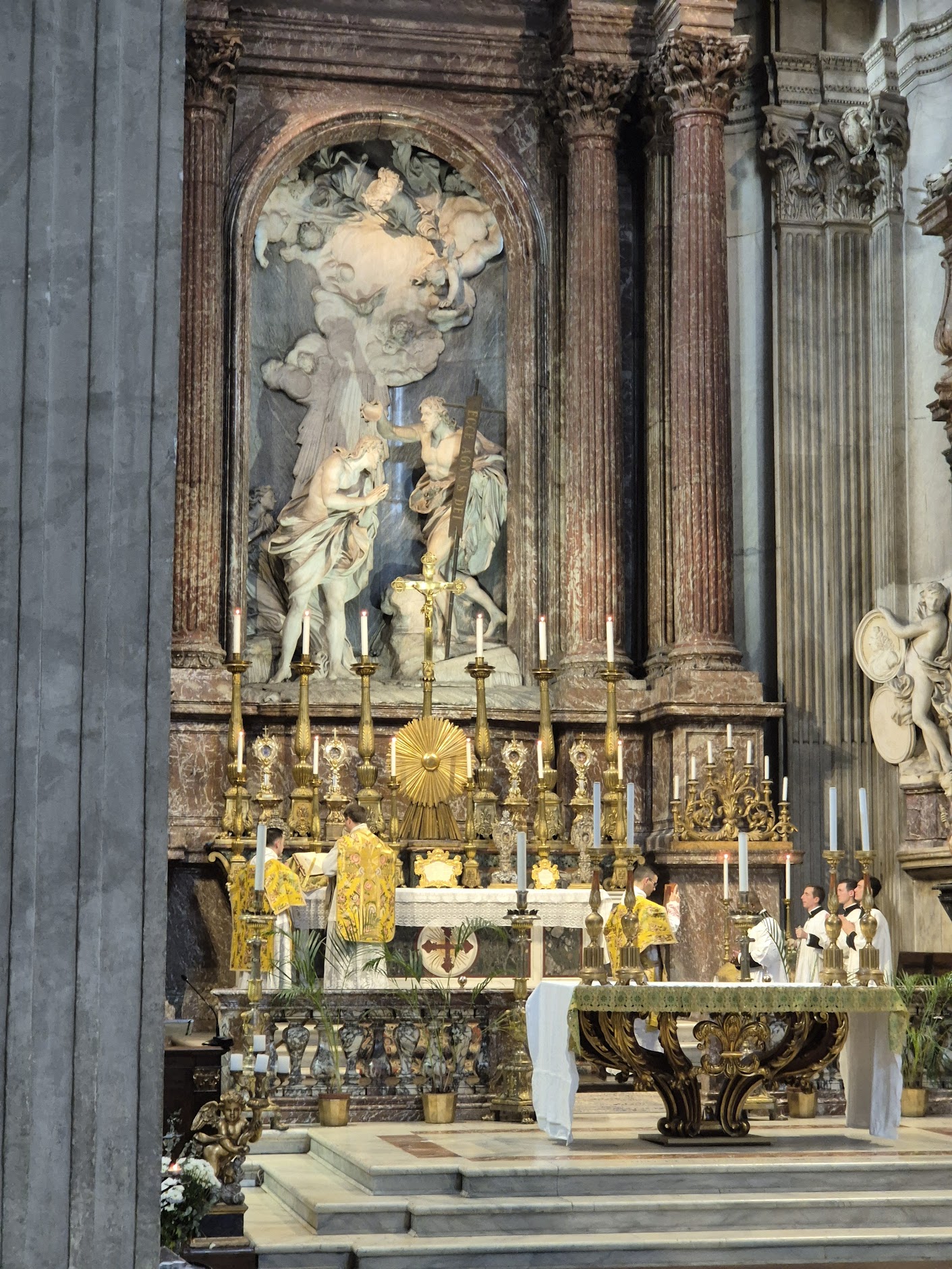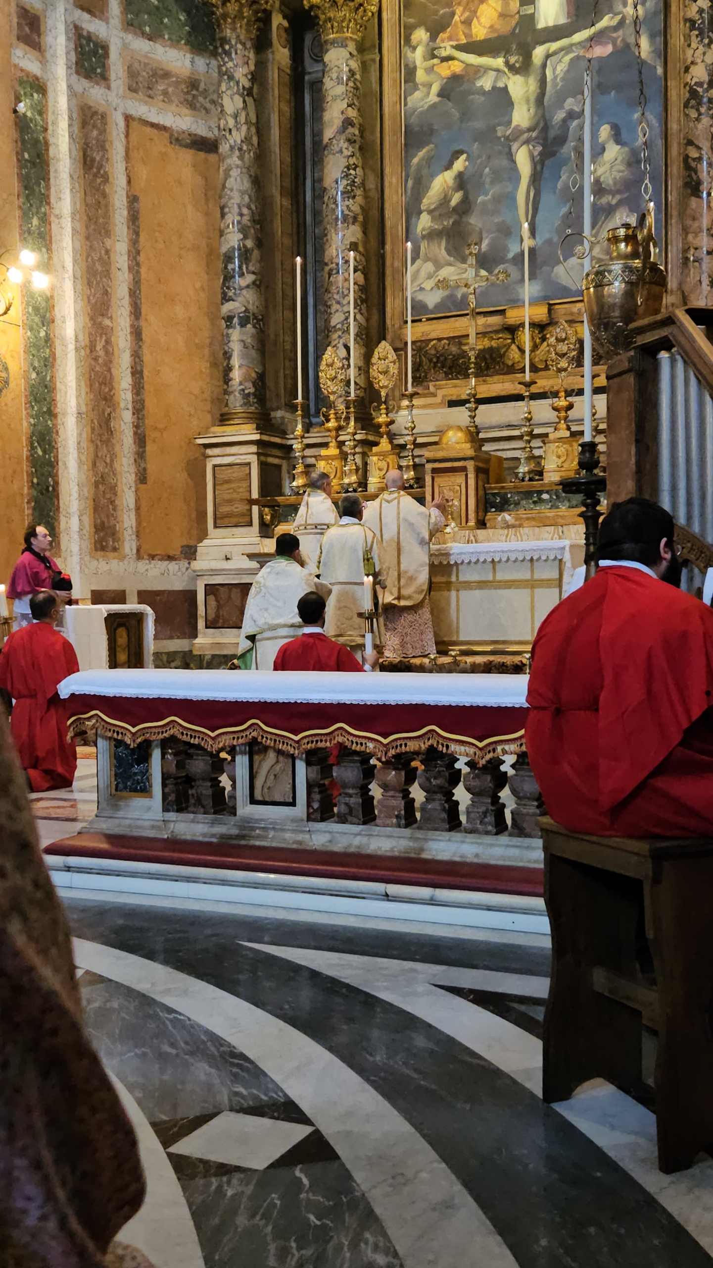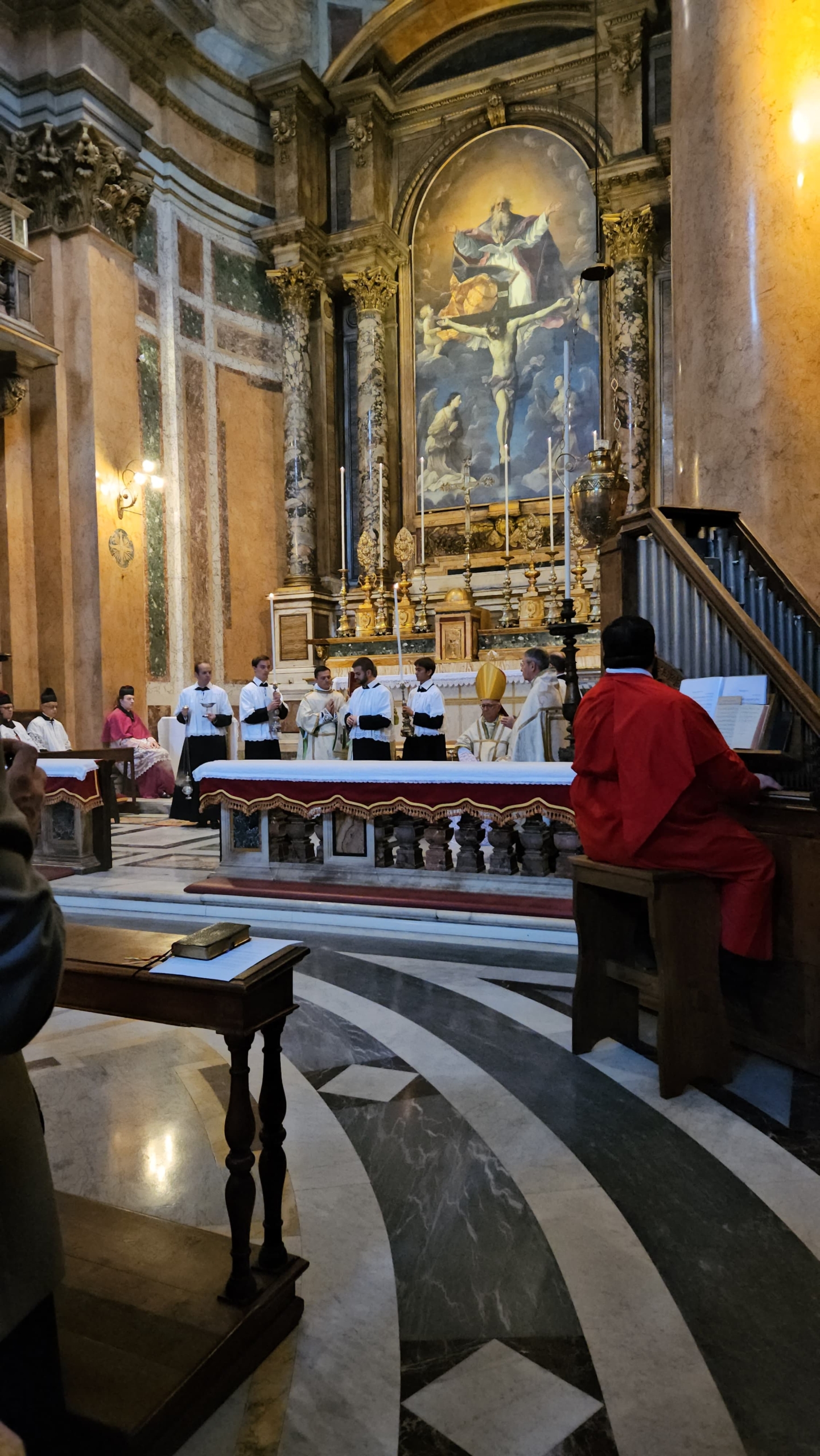 Prva, jutarnja Misa slavila se u bazilici sv. Ivana Krstitelja dei Fiorentini. Trojnu Misu slavio je vlč. Antoine Landais iz Instituta Krista Kralja Velikog Svećenika (ICRSP), koji je prije homilije podsjetio vjernike na posebnu povlasticu ove družbe apostolskog života papinskog prava, a to je da svaki vjernik koji na svetkovinu Krista Kralja pohodi Misu koju slave njihovi svećenici može dobiti potpuni oprost (uz ostale redovite uvjete). Nakon sv. Mise vjernici su se imali prilike družiti sa svećenicima i bogoslovima ICRSP-a, kao i dati svoj prilog za bogosloviju.