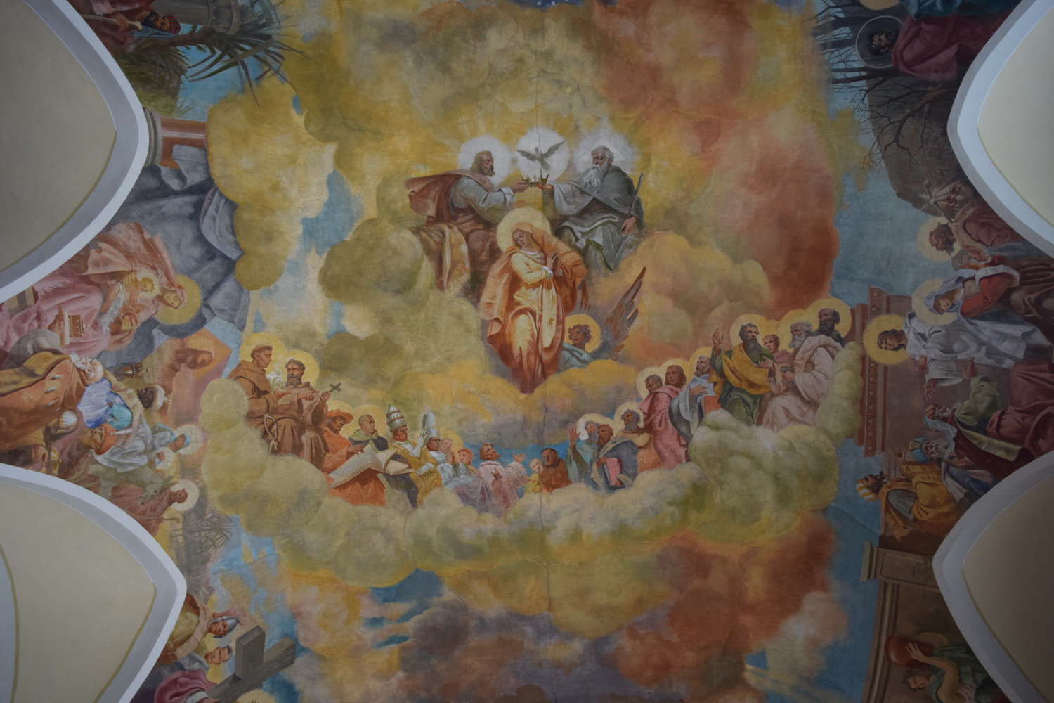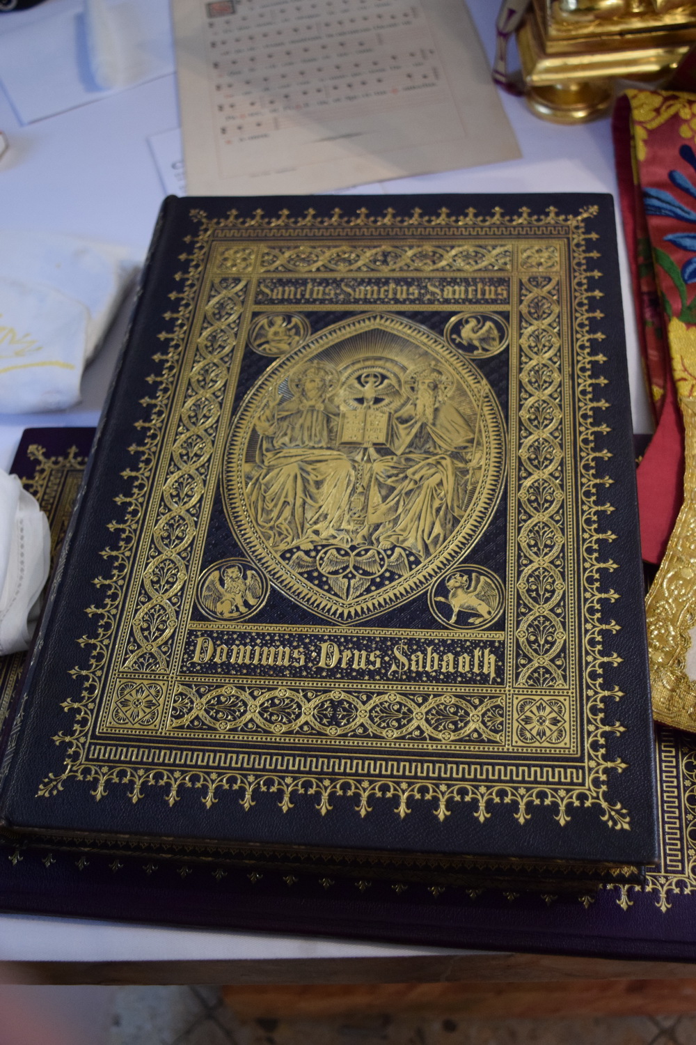 Pjevanje Sanctusa. Ispred oltara su prisutna petorica ministranata, od kojih jedan nosi stijeg s izvezenim natpisom “Sanctus”.