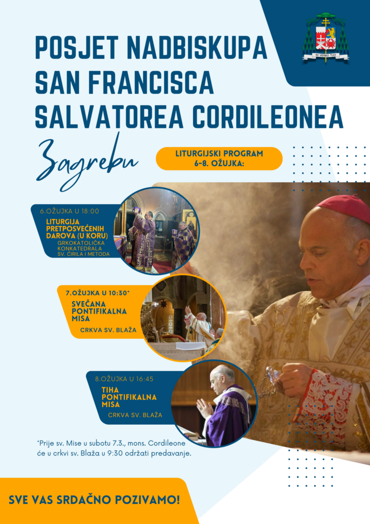 Ovim putem vam najavljujemo radosnu vijest, Zagreb će ovih dana posjetiti nadbiskup San Francisca, mons. Salvatorea Cordileone. Uz brojne druge aktivnosti u našem glavnom gradu, mons. Cordileone će za našu zajednicu vjernika čak dva puta slaviti i tradicionalne Mise. U dogovoru sa Zagrebačkom nadbiskupijom zainteresiranim vjernicima možemo ponuditi bogat liturgijski program za vrijeme nadbiskupovog boravka u Zagrebu. Detalje donosimo u nastavku: